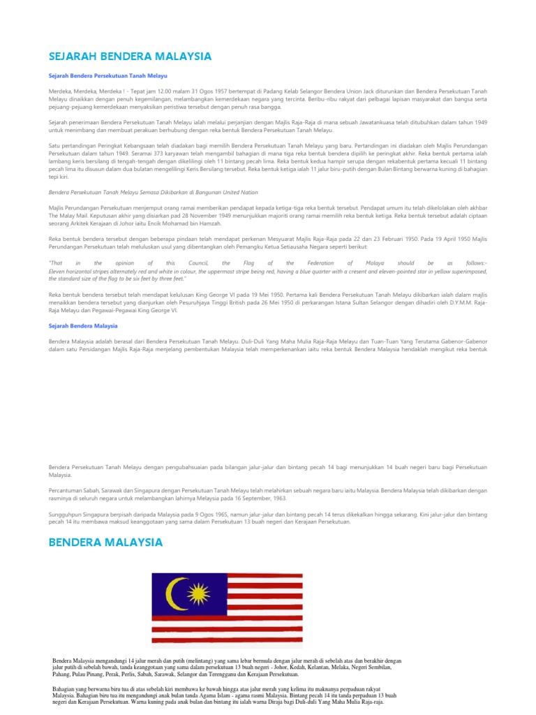 Pagi 31 ogos 1957,tunku abdul rahman telah mengisytiharkan. Perkumpulan perundangan persekutuan memberi kesempatan kepada masyarakat untuk memberikan pendapat kepada ketiga rancangan tersebut. Bendera persekutuan tanah melayu yang sebelum ini berjumlah 11 jalur melintang berwarna merah dan putih telah bertambah jalurnya kepada 14 jalur sebaik sahaja kemasukan sabah, sarawak dan singapura dalam persekutuan malaysia pada 16 september 1963. Pada 26 mei 1950, buat pertama kalinya bendera persekutuan tanah melayu telah dikibarkan di hadapan istana sultan selangor di kuala lumpur. Ini merupakan peristiwa yang bersejarah kerana dari detik inilah persekutuan tanah melayu mempunyai benderanya sendiri yang menjadi simbol wujudnya sebuah. Manuskrip perjanjian pemasyhuran kemerdekaan tanah melayu. Dalam penyelidikan yang dijalankan, arkib negara telah menemui dokumen yang ditandatangani oleh seorang yang bernama encik mohamed bin hamzah dihantar kepada 'clerk of councils' , the council chamber, kuala lumpur, memajukan cadangan rekabentuk bendera persekutuan tanah melayu. Ketika allahyarham berusia 29 tahun, majlis perundangan persekutuan tanah melayu menganjurkan pertandingan merekacipta bendera bagi tanah melayu yang bakal merdeka. Bendera itu digantikan dengan bendera persekutuan tanah melayu. Allahyarham yang merupakan seorang arkitek jabatan kerja raya johor telah menyertai pertandingan tersebut. Pada 1 april 1946,malayan union diisytiharkan di. · kepentingan perjanjian persekutuan tanah melayu. Selepas penubuhan malaysia pada 16 september 1963, bendera persekutuan tanah melayu telah diubahsuai sejajar dengan kemasukan sarawak, sabah dan singapura ke dalam persekutuan tanah melayu.