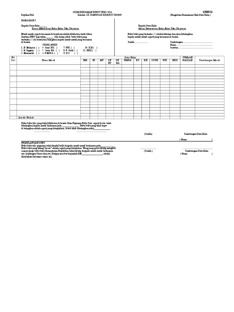 Kepada guru besar pengetua penolong kanan hem pk ii kuasa membahagi buku buku teks pinjaman akuan terima buku buku teks pinjaman murid murid yang disenaraikan namanya di bawah. Senarai nama, harga dan kod buku tahun 1 hingga 6 (2015) (download). Contoh borang nikah selangor 2018 download borang 14a pejabat tanah selangor contoh mengisi borang keberhasilan guru borang w singapore contoh borang soal selidik ceramah kad kahwin johor bahru 2019 cara mengisi borang maklumat murid 2019 epf. Penyampaian hadiah minggu spbt 2018. Borang rekod pinjaman buku tek.