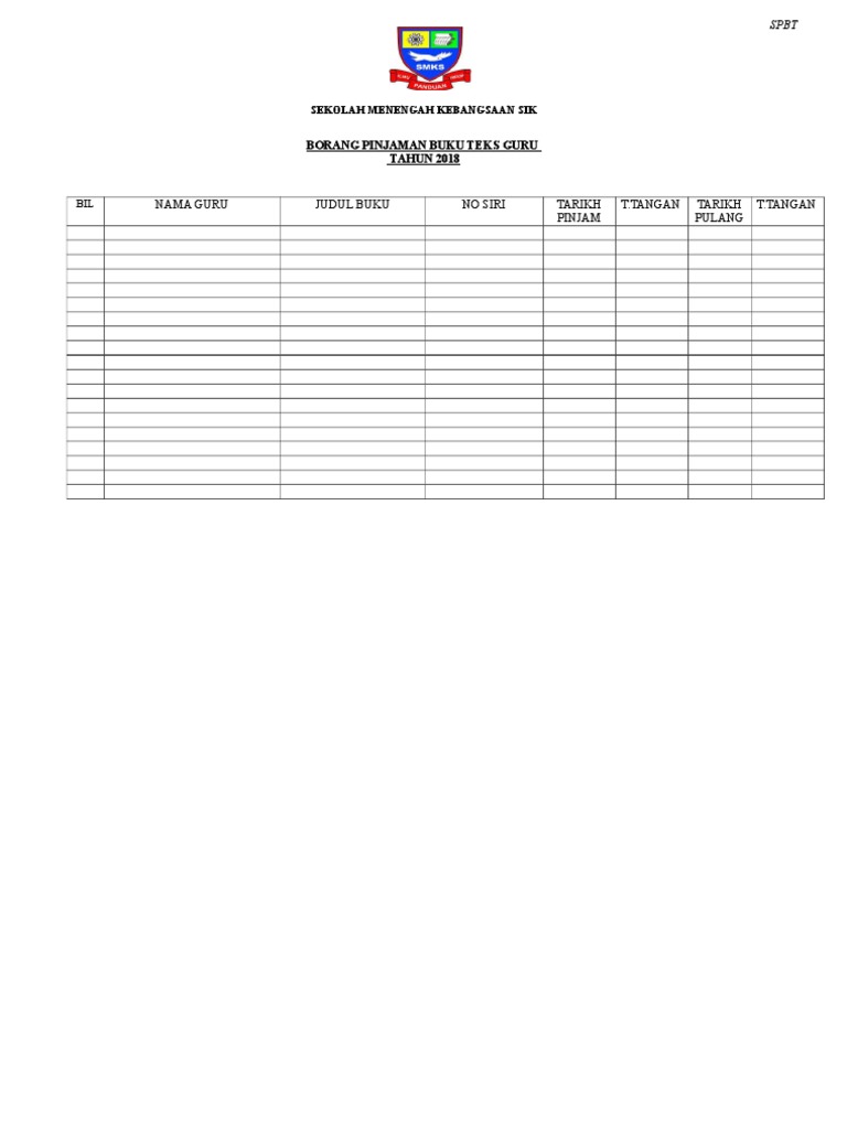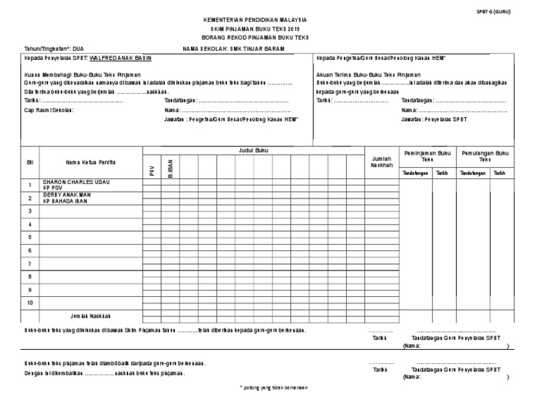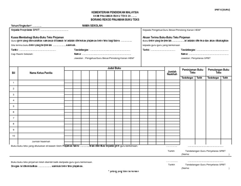 Read this essay on borang g spbt. Borang rekod murid tidak memulang buku teks. Borang rekod pinjaman buku tek. Borang spbt g pelupusan buku teks • surat permohonan pelupusan rekod buku hilang, • surat kelulusan anm rosak dan gantian • salinan boring arkib 12/08 (salinan bukti, gambaratau resit) • surat makluman ibu bapa penyeliaan dan • dokumen , penyata dan laporan kehilangan. (borang ini diberikan percuma) rujukan fail :