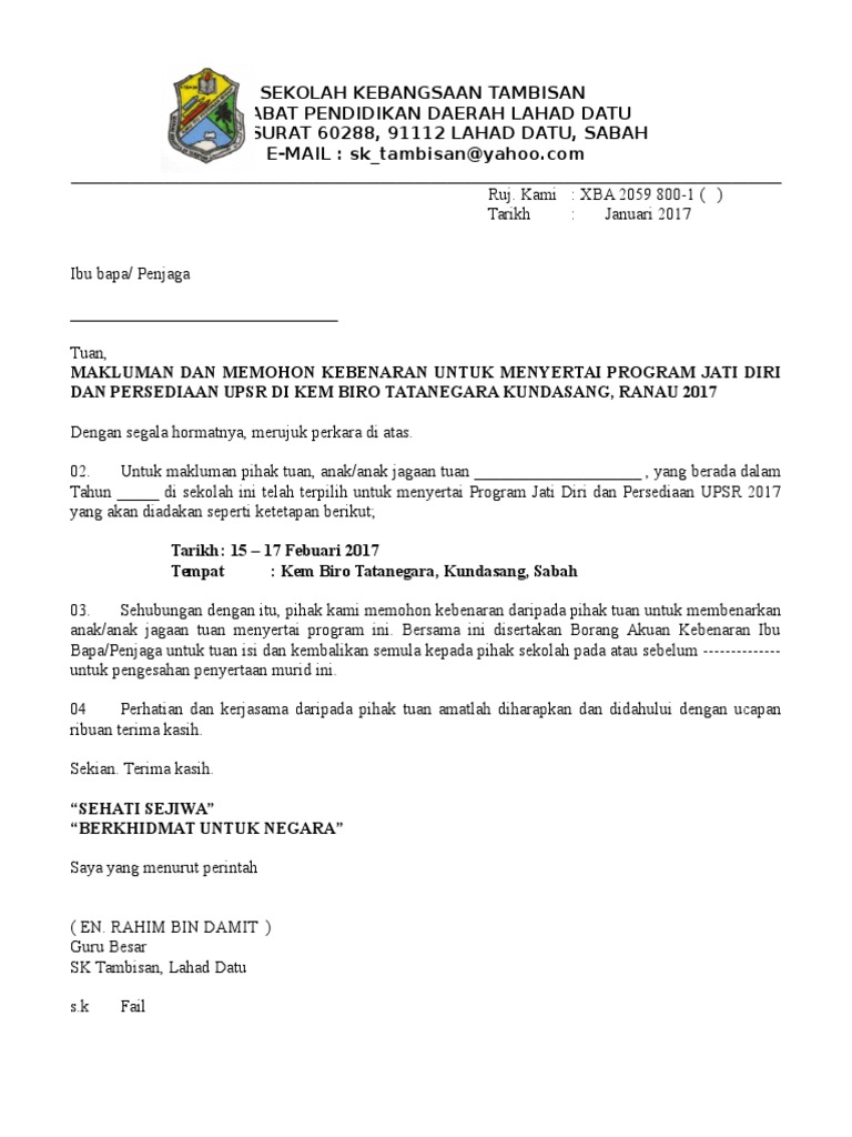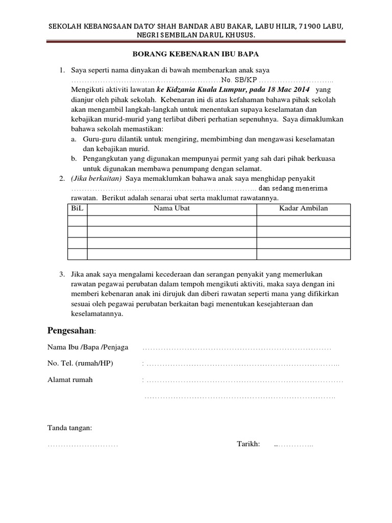 Archive for the 'surat kebenaran ibu bapa / penjaga' category. Saya seperti nama dinyatakan di bawah membenarkan anak. Memuat turun borang borang kebenaran rentas negeri. Sila muat turun borang permit pergerakan perintah kawalan pergerakan (pkp) atau borang permit. · surat akuan dan kebenaran ibu/bapa/penjaga. Contoh borang kebenaran untuk murid keluar atau mewakili sekolah by charles_koh_1 in topics. Surat pengesahan kursus/praktikal bermula semula dari pihak universiti 4. Kebenaran dari pihak imigresen negara pengajian. Perhatian buat ibu bapa/ penjaga yang ingin mendaftar anak ke sekolah rendah kerajaan tahun 2018 dan 2019 nanti. Masih meributkan tentang siapa ibu sarada sebenarnya? Hadir di tempat aktiviti 10 minit sebelum aktiviti dimulakan dan mengawasi murid sepanjang masa untuk mengelakkan berlakunya sebarang masalah yang tidak diingini. Ibu bapa pun wajib tahu tentang sop buka semula sekolah. Mengedarkan borang kebenaran ibu bapa/ penjaga untuk dipenuhkan dan dikumpulkan semula sebelum aktiviti dijalankan.