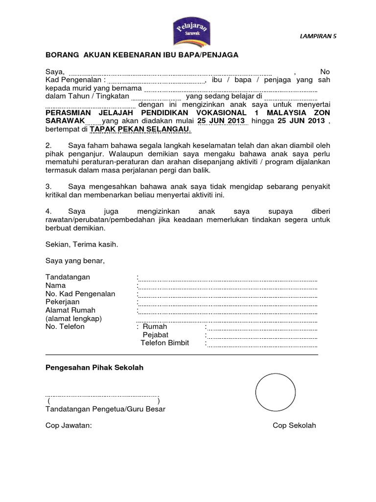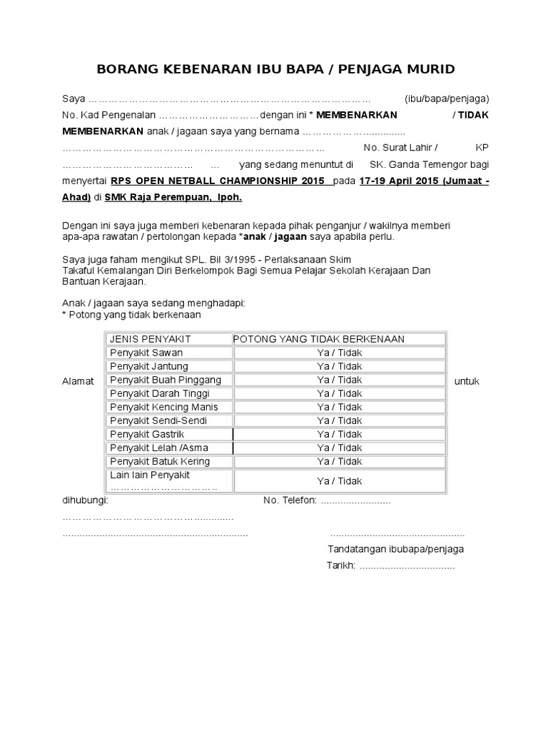 Saya i bapa/ibu/penjaga kepada father/mother/guardian to. · surat akuan dan kebenaran ibu/bapa/penjaga. · surat akuan dan kebenaran ibu/bapa/penjaga. Ibu bapa disaran mendapatkan surat kebenaran dari pihak sekolah bagi tujuan merentas negeri untuk mengambil anak mereka di sekolah berasrama penuh dalam tempoh pelaksanaan perintah kawalan pergerakan bersyarat (pkpb). Kebenaran dari pihak imigresen negara pengajian.