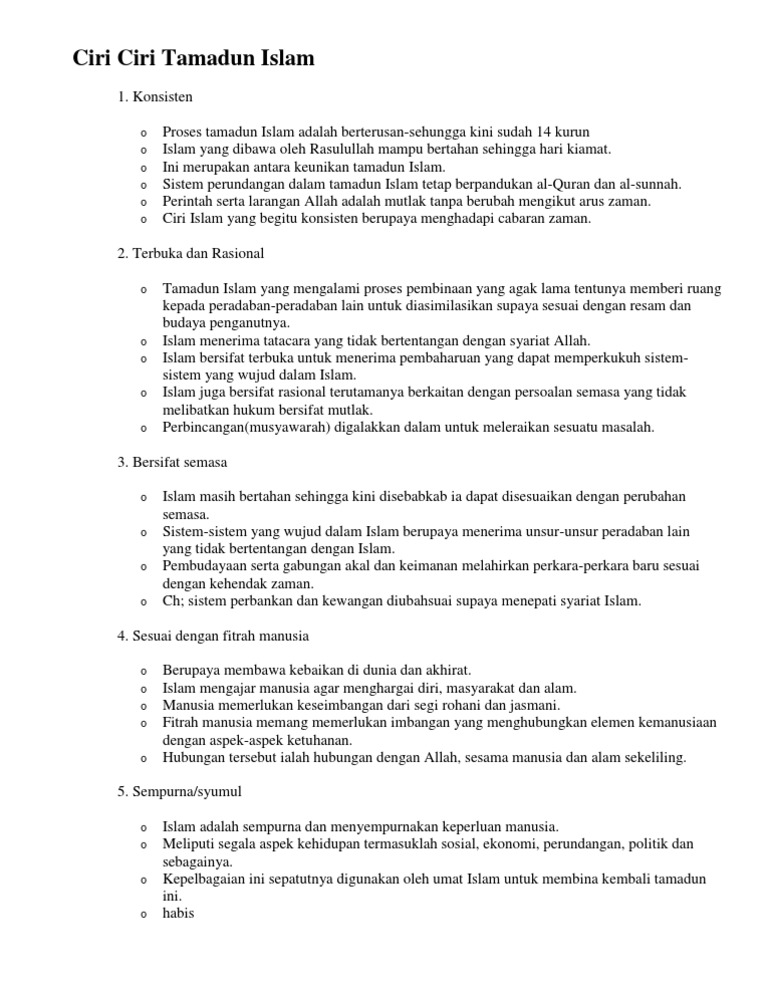 Farmer dalam bukunya comparative history of civilization in asia menggariskan tujuh ciri utama tamadun Dalam tamadun islam kesemua ciri ini berasaskan agama. Ketuhanan, allah adalah punca segala kekuasaan, kuasa pada manu. Tamadun islam bersifat sejagat dan terbuka. Hubungan manusia dengan allah swt, hubungan sesama manusia dan hubungan manusia dengan.